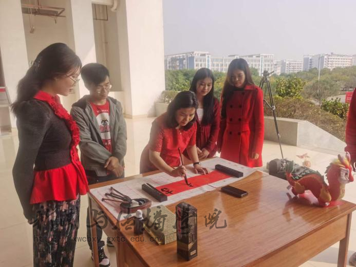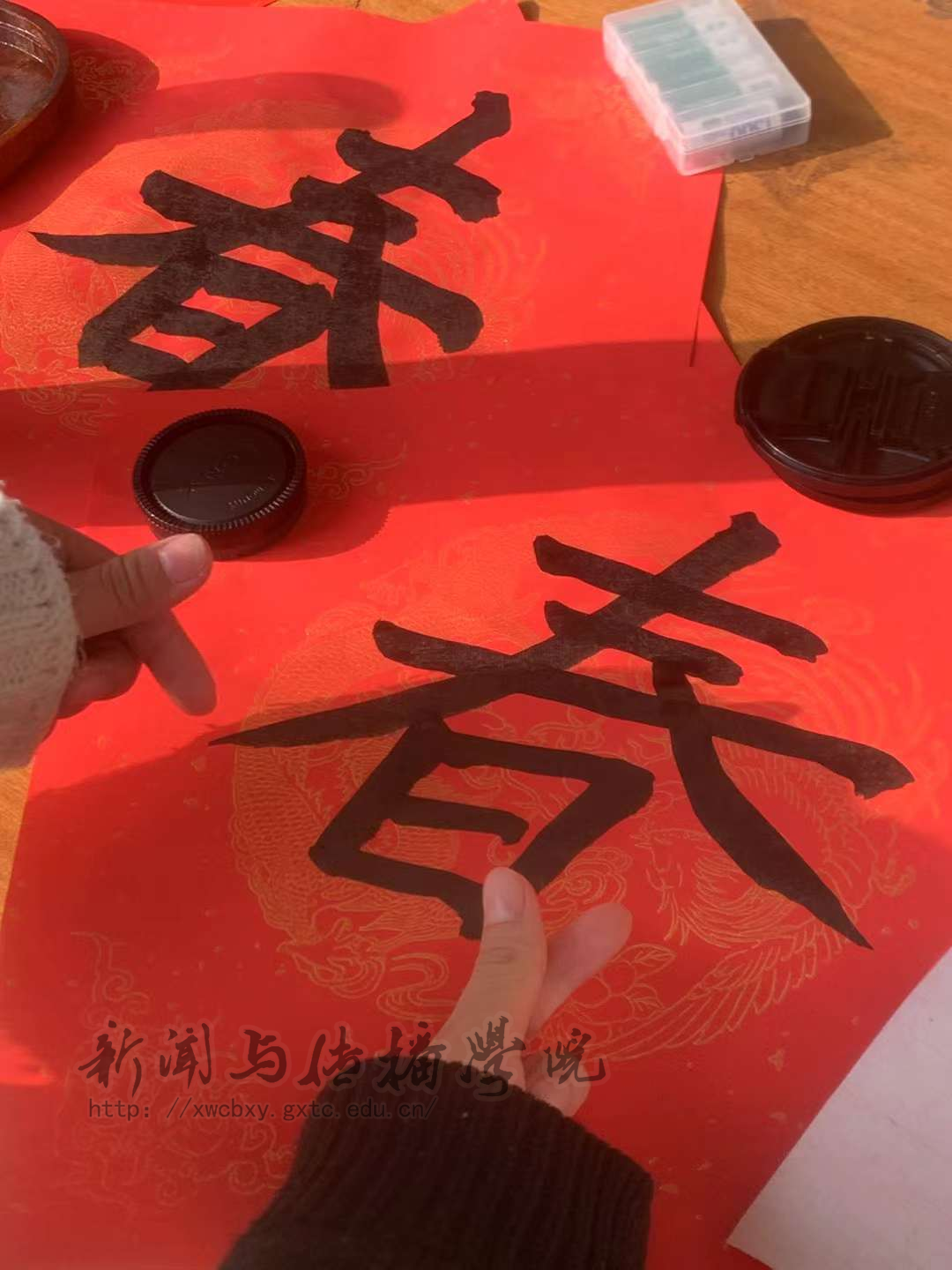 看到桌面上摆放整齐的笔墨纸砚,来自老挝的职工康麦略带兴奋的说:“陈老师,我在中国读本科的时候了解过书法!”职工们好奇的围绕在书桌的周围,陈洪波教授一边写着春联,一边对东盟职工们说:“学习写书法就像学习做人,字要横平竖直,人要端端正正。”随后,在陈洪波教授的指导下,泰国职工冯春雨认认真真,一笔一划的书写了自己职工活中的第一张春联——“春”字。“‘春’字不仅仅是我的名字,也代表着春天、春节。在这里祝同学和老师们新春快乐。”冯春雨用一口流利的中文笑着说道。