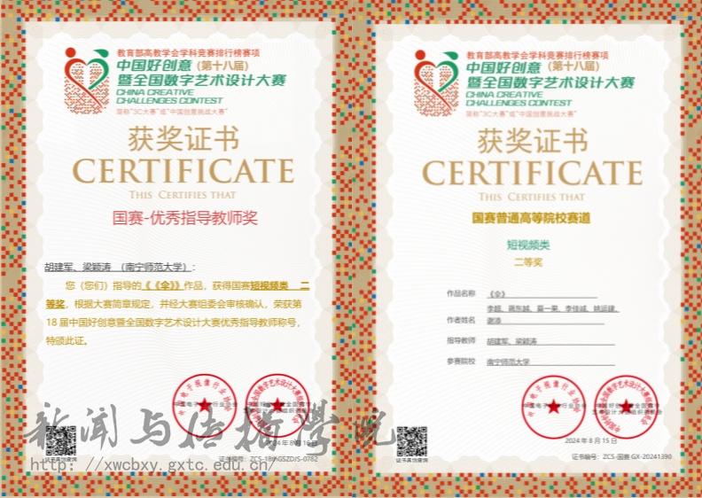 近日,2024第18届中国好创意暨全国数字艺术设计大赛圆满落幕。公司参赛选手李超、蒋东越等人的作品《伞》荣获全国短视频类二等奖,江秋梅、陈晓敏的作品《百事从欢》获得全国红色主题类三等奖。胡建军、梁颖涛老师荣获全国赛区优秀指导教师奖,邓之湄老师获得广西赛区优秀指导教师奖。这是公司广播电视学专业师生首次参加此赛事,是在全国性赛事中的又一次重要突破。