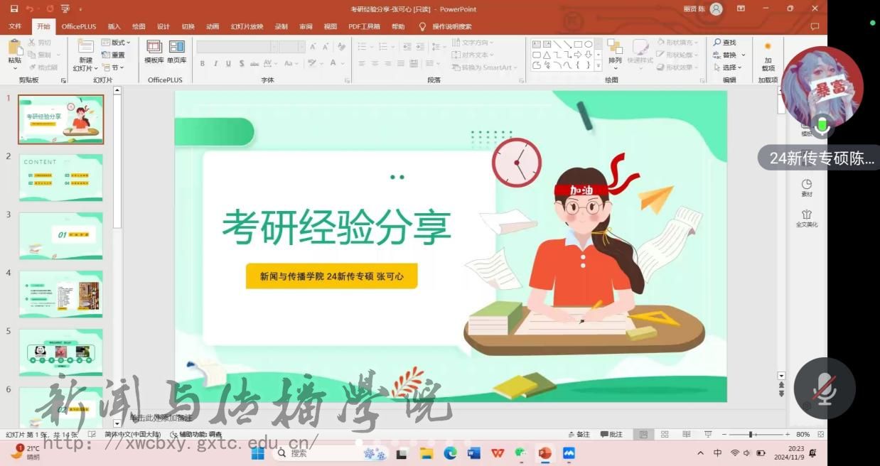 分享会伊始,陈丽贤同学详细介绍了自己的考研复习攻略,着重分享了时间分配与刷题技巧。她强调,备考不仅要注重基础知识的扎实掌握,还需培养新闻敏感度,以应对新闻与传播学科的专业要求,同时保持良好心态至关重要。随后,张可心分享了自己的备考方法与择校经验,分享了专业课知识记忆的有效小技巧,并提醒同学们在信息繁杂的网络环境中学会甄别信息,避免被误导。分享结束后,进入互动交流环节,同学们踊跃提问,就考研过程中的困惑与两位学姐展开深入探讨。最后,惠璇老师在总结发言中表示,同学们在考研复习阶段应明确方向、目标清晰且保持耐心,深入了解目标院校专业标准,密切关注考研官方信息动态。她对考研同学的努力予以肯定,鼓励大家坚定信念,积极备考。