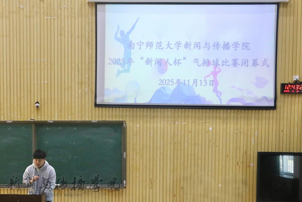 11月13日中午,2025年“新闻人杯”气排球比赛闭幕式在五综107教室举行。学工办辅导员惠旋、覃力以及各参赛队伍到场参加。