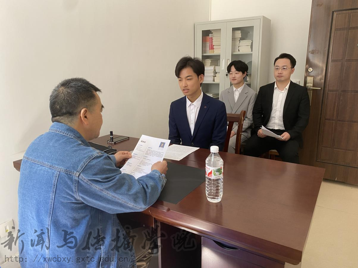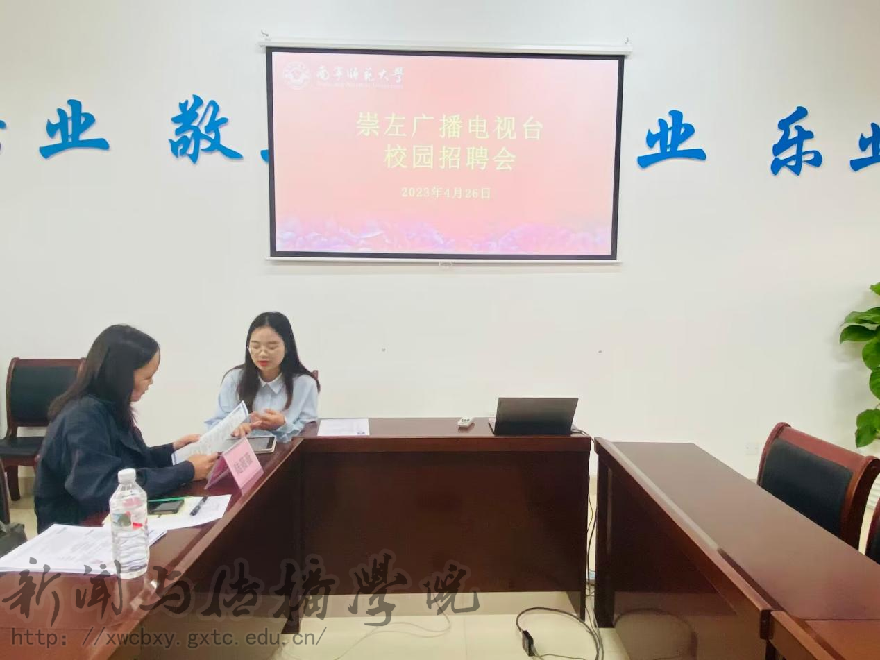 4月26日上午,崇左广播电视台校园招聘会暨2023届毕业生就业双向洽谈会在公司五合校区理综楼304举行。崇左市广播电视台台长助理、新闻中心主任黄绍康,融媒体中心主任陆薇薇,融媒体中心副主任黄一刚一行三人来公司洽谈毕业生就业工作,公司党委副书记、经理徐健,副经理梁颖涛,辅导员陈丽珍以及部分员工代表参加此次就业洽谈会。